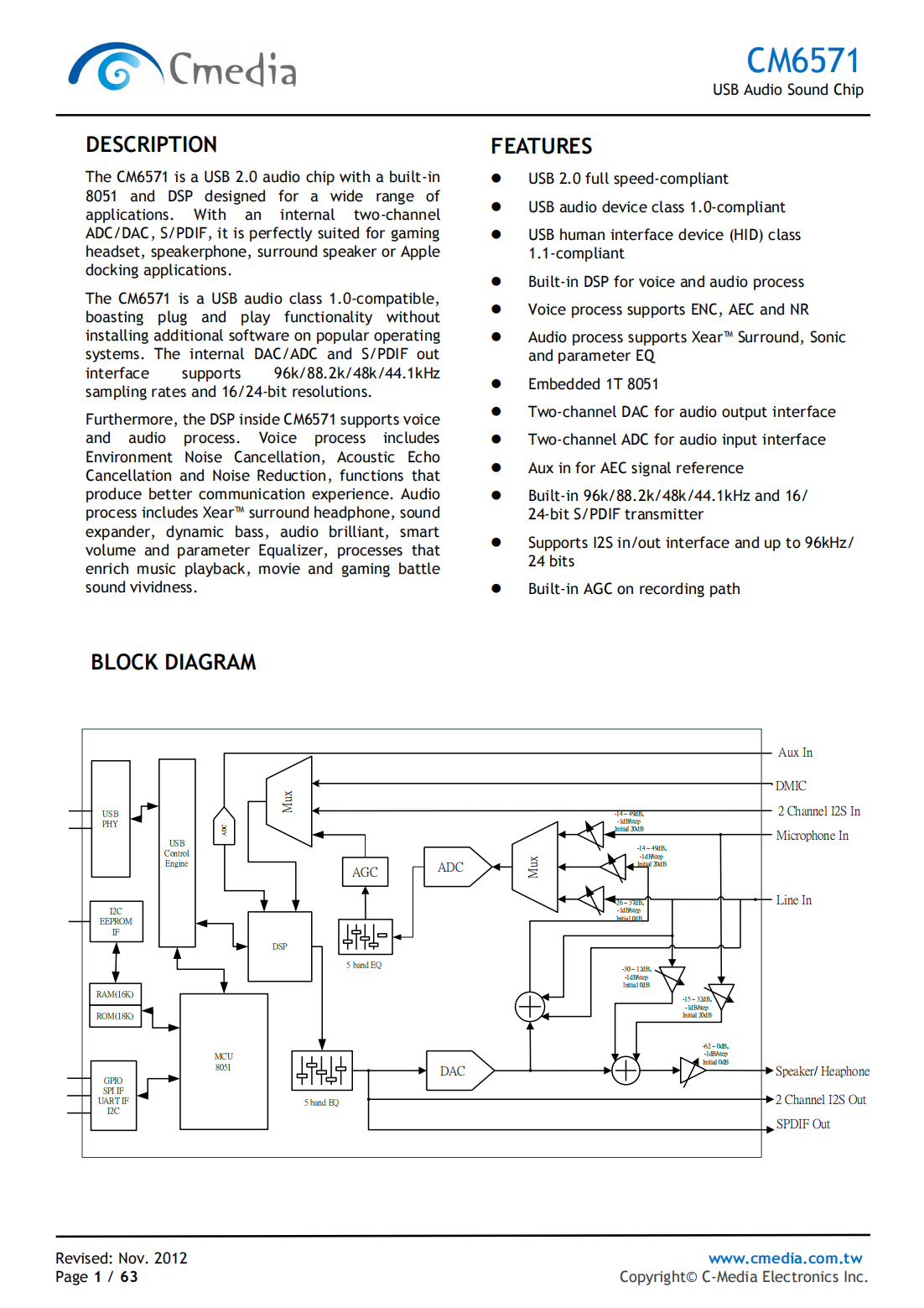 The CM6571 is a USB 2.0 audio chip with a built-in 8051 and DSP for a wide range of applications. With an internal 2-channel ADC/DAC, S/PDIF, it is perfectly suited to gaming headset, speaker phone, surround speaker or apple docking applications.