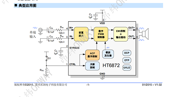 HT6872的最大特點是防削頂失真(ACF)輸出控制功能,可檢測并抑制由于輸入音樂、語音信號幅度過大所引起的輸出信號削頂失真(破音),也能自適應地防止在電池應用中由電源電壓下降所造成的輸出削頂,顯著提高音質,創(chuàng)造非常舒適的聽音享受,并保護揚聲器免受過載損壞。同時芯片具有ACF-Off模式。