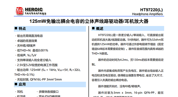 HT97220(L)是一款差分輸入/單端輸入、可直接輸出驅(qū)動(dòng)的耳機(jī)放大器/線路驅(qū)動(dòng)器。5V供電時(shí),器件可為32ohm耳機(jī)提供125mW的功率。器件可通過外部電阻調(diào)節(jié)增益(固定增益6dB版本需要提前定制)。器件在音頻范圍內(nèi)具有卓越的THD+N表現(xiàn)。器件的啟動(dòng)時(shí)間為4.2ms,另130ms的版本需要提前定制。器件內(nèi)部集成電荷泵產(chǎn)生負(fù)電壓,器件輸出級由輸入正電壓和該負(fù)電壓驅(qū)動(dòng),使得輸出偏置在零電位,省去了大尺寸、容易引入失真的輸出耦合電容。器件使能開關(guān)時(shí),沒有咔嗒/噼噗聲。