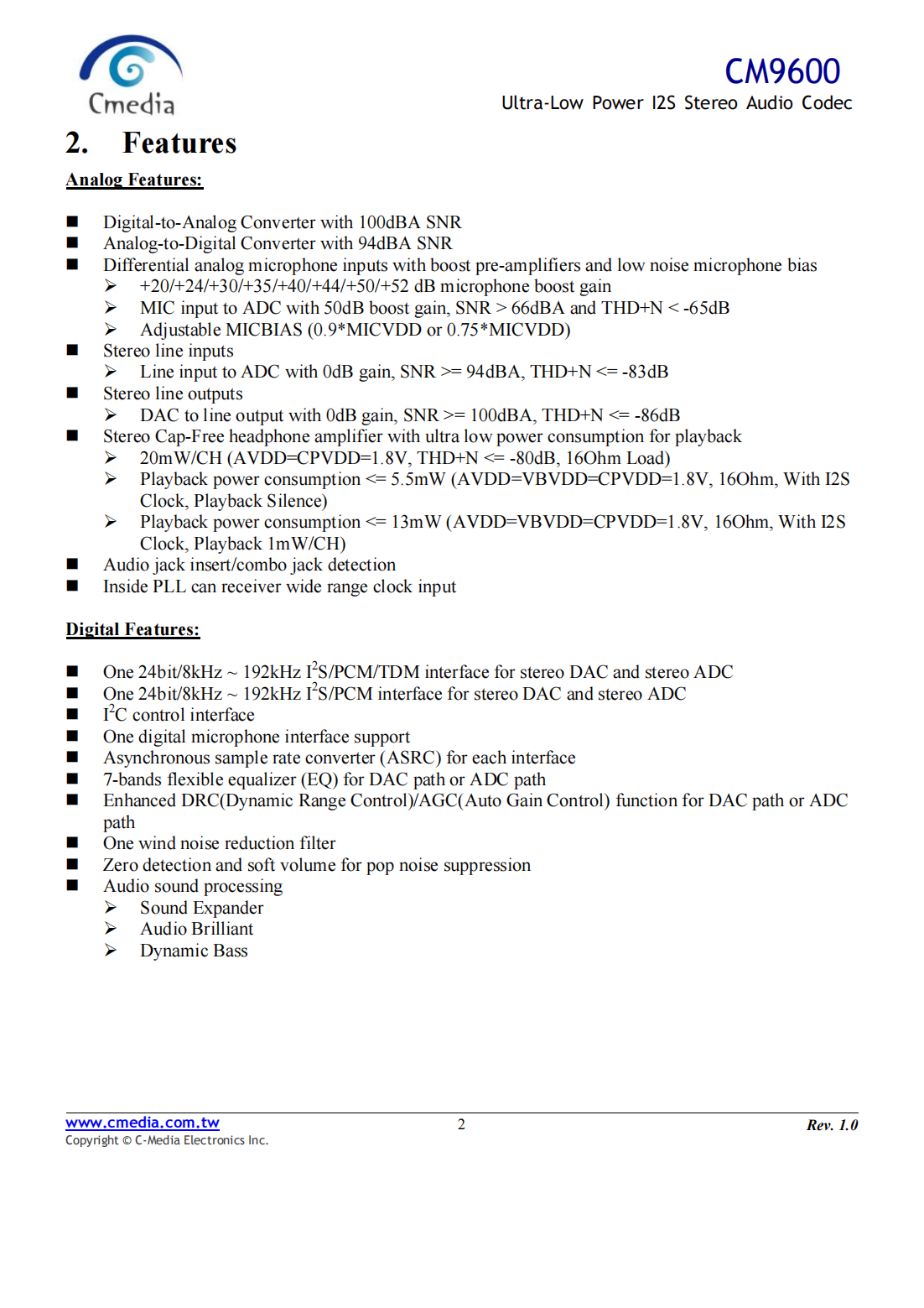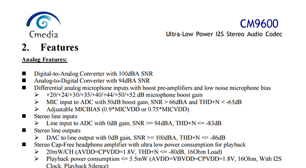 CM9600_低功耗I2S立體聲音頻編解碼器