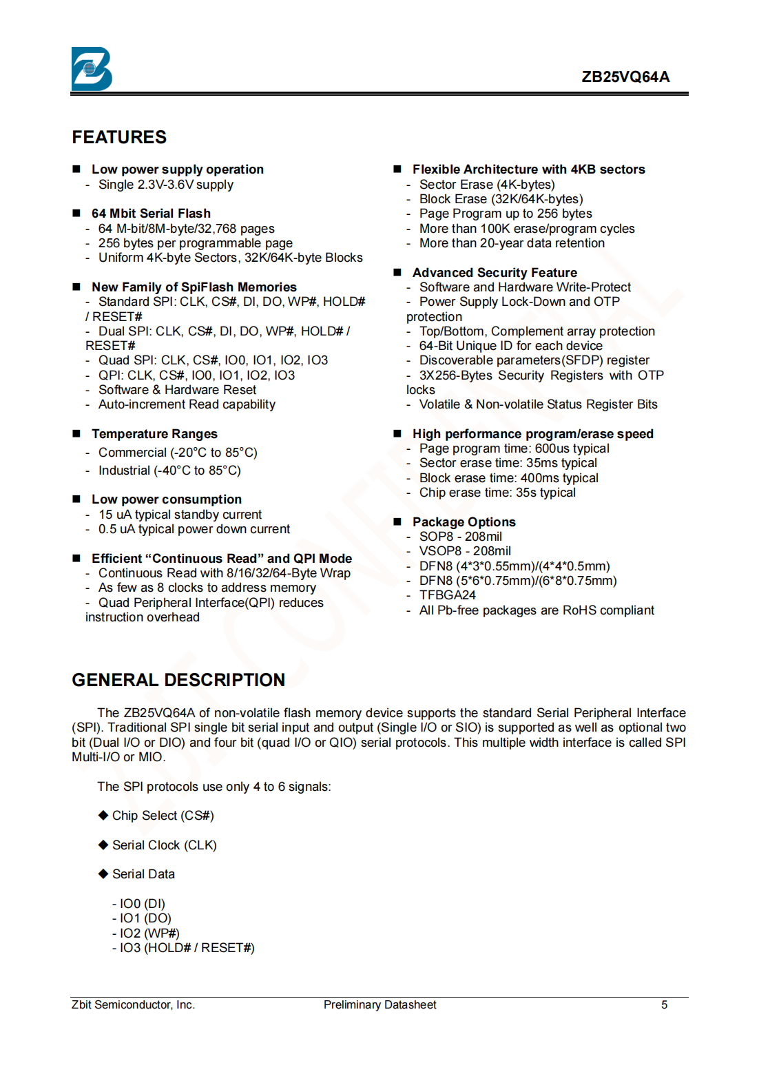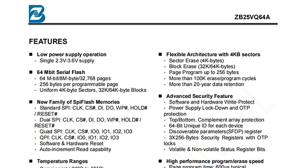 The ZB25VQ64A of non-volatile flash memory device supports the standard Serial Peripheral Interface (SPI).