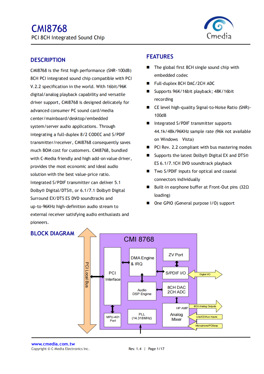 CMI8768 is the first high performance (SNR~100dB) 8CH PCI integrated sound chip compatible with PCI V.2.2 specification in the world