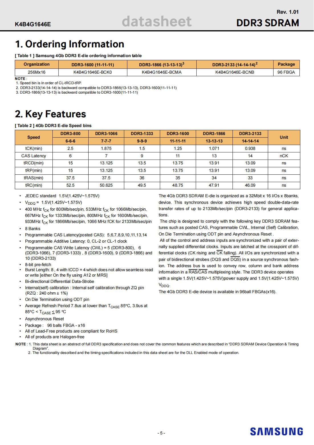 The 4Gb DDR3 SDRAM E-die is organized as a 32Mbit x 16 I/Os x 8banks, device. This synchronous device achieves high speed double-data-rate transfer rates of up to 2133Mb/sec/pin (DDR3-2133) for general applications