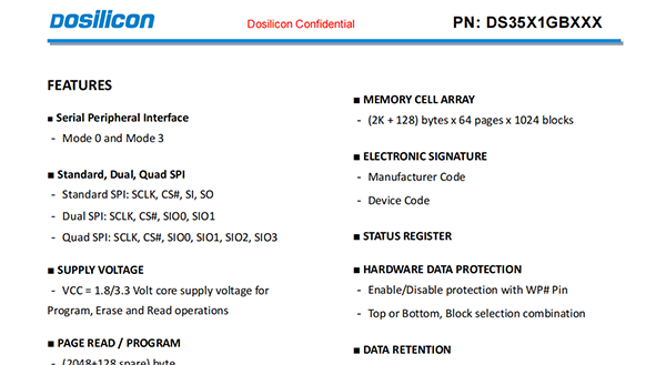 DS35X1GBXXX is a 128Mx8bit with spare 8Mx8 bit capacity. The device is offered in 3.3/1.8 Vcc Power Supply, and with SPI interface
