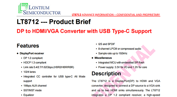 The LT8712 is a DisplayPort(DP) to HDMI and VGA converter, designed to connect a DP source to a VGA sink and up to two HDMI sinks simultaneously