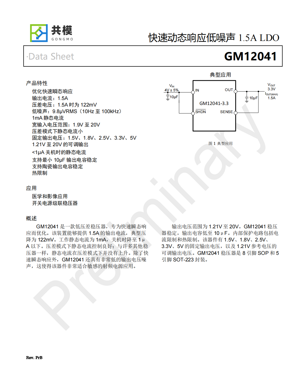 GM12041穩(wěn)壓器穩(wěn)定,輸出電容低至10μF。內(nèi)部保護(hù)電路包括電流限制和熱限制。該器件有1.5V、1.8V、2.5V、3.3V、5V的固定輸出電壓,以及1.21V參考電壓的可調(diào)輸出電壓。GM12041穩(wěn)壓器是8引腳SOP和5引腳SOT-223封裝。