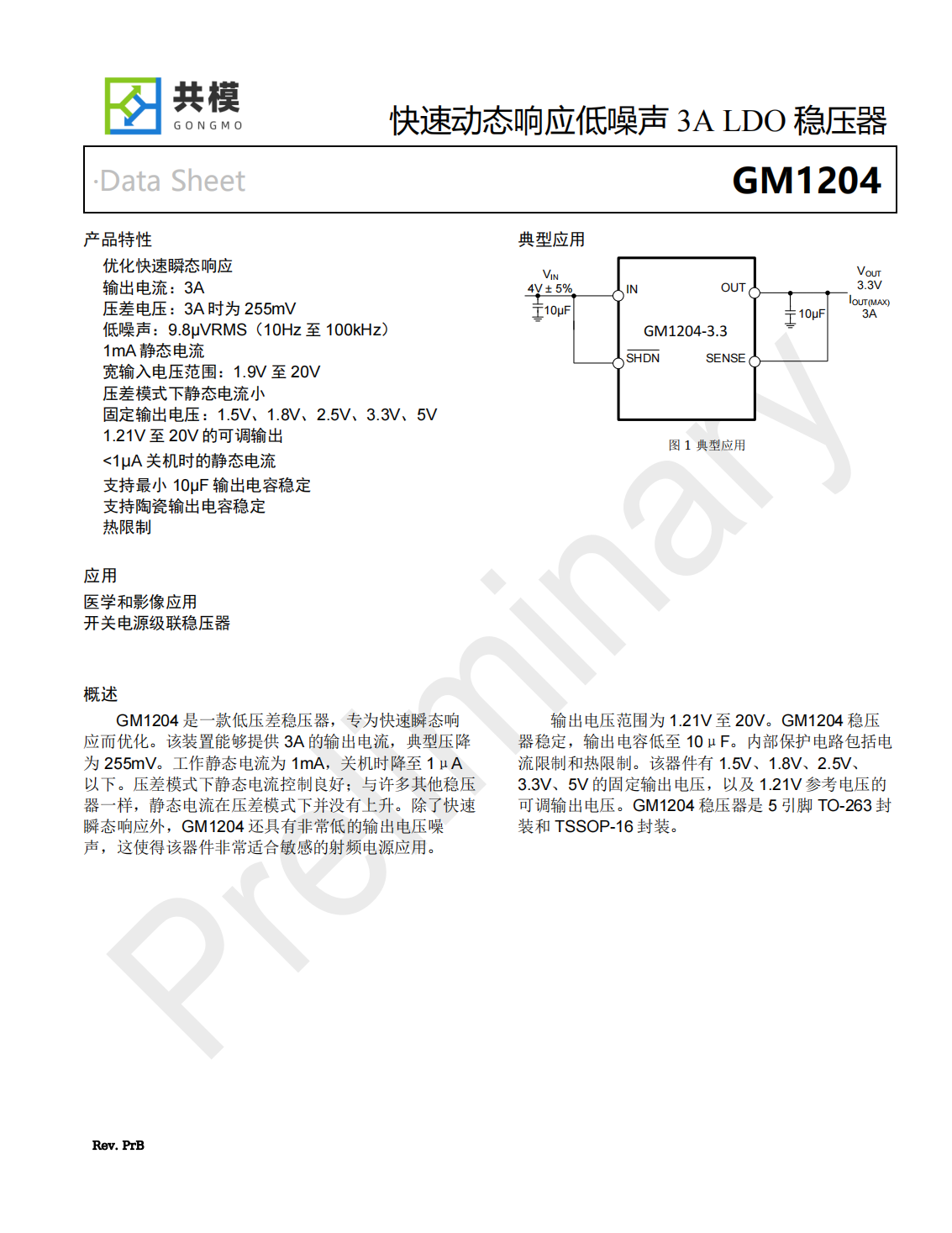 GM1204是一款低壓差穩(wěn)壓器,專為快速瞬態(tài)響應而優(yōu)化。該裝置能夠提供3A的輸出電流,典型壓降為255mV。工作靜態(tài)電流為1mA,關機時降至1μA以下。壓差模式下靜態(tài)電流控制良好;與許多其他穩(wěn)壓器一樣,靜態(tài)電流在壓差模式下并沒有上升。除了快速瞬態(tài)響應外,GM1204還具有非常低的輸出電壓噪聲,這使得該器件非常適合敏感的射頻電源應用。輸出電壓范圍為1.21V至20V。GM1204穩(wěn)壓器穩(wěn)定,輸出電容低至10μF。內(nèi)部保護電路包括電流限制和熱限制。該器件有1.5V、1.8V、2.5V、3.3V、5V的固定輸出電壓,以及1.21V參考電壓的可調(diào)輸出電壓。GM1204穩(wěn)壓器是5引腳TO-263封裝和TSSOP-16封裝。