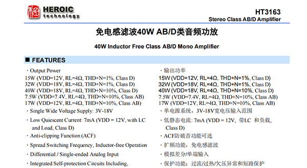 40W(VDD=18V,RL=4?,THD+N=10%,Class D)
