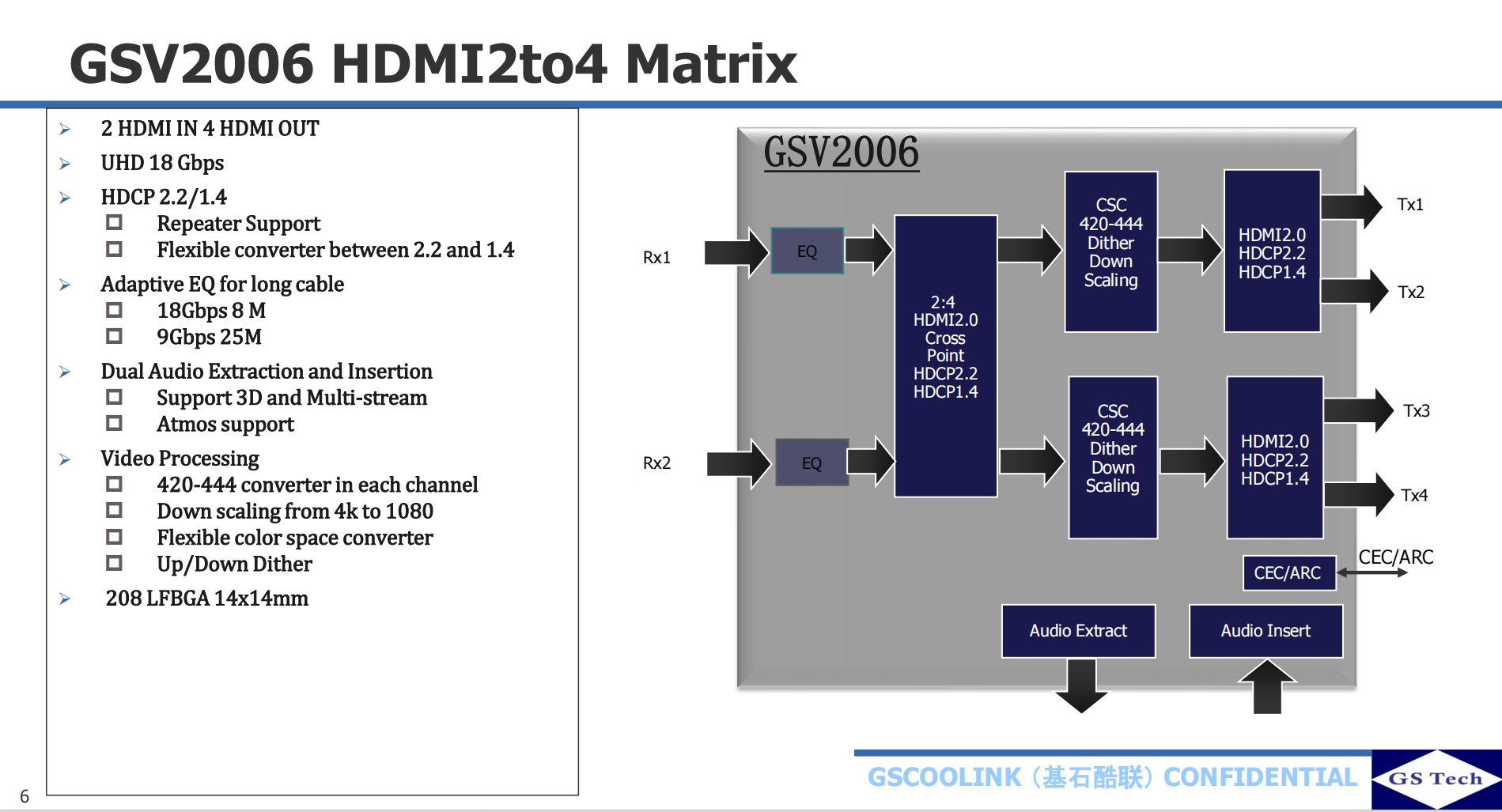 GSV2006 can support up to 8-channel I2S,2-channel S/PDIF,3D and multi-stream audio.In TDM mode,each audio pin supports up to 8 channels.Internal Scaler and Color Space Converter enables the input and output to be timing format independent and capable of long distance transmission.With powerful HDMI Rx equalizer and Tx pre-emphasis capability,GSV2006 can cascade itself(or GSV2000 series chips)with at least 7 stages for all HDMI 1.3/1.4/2.0 timings.