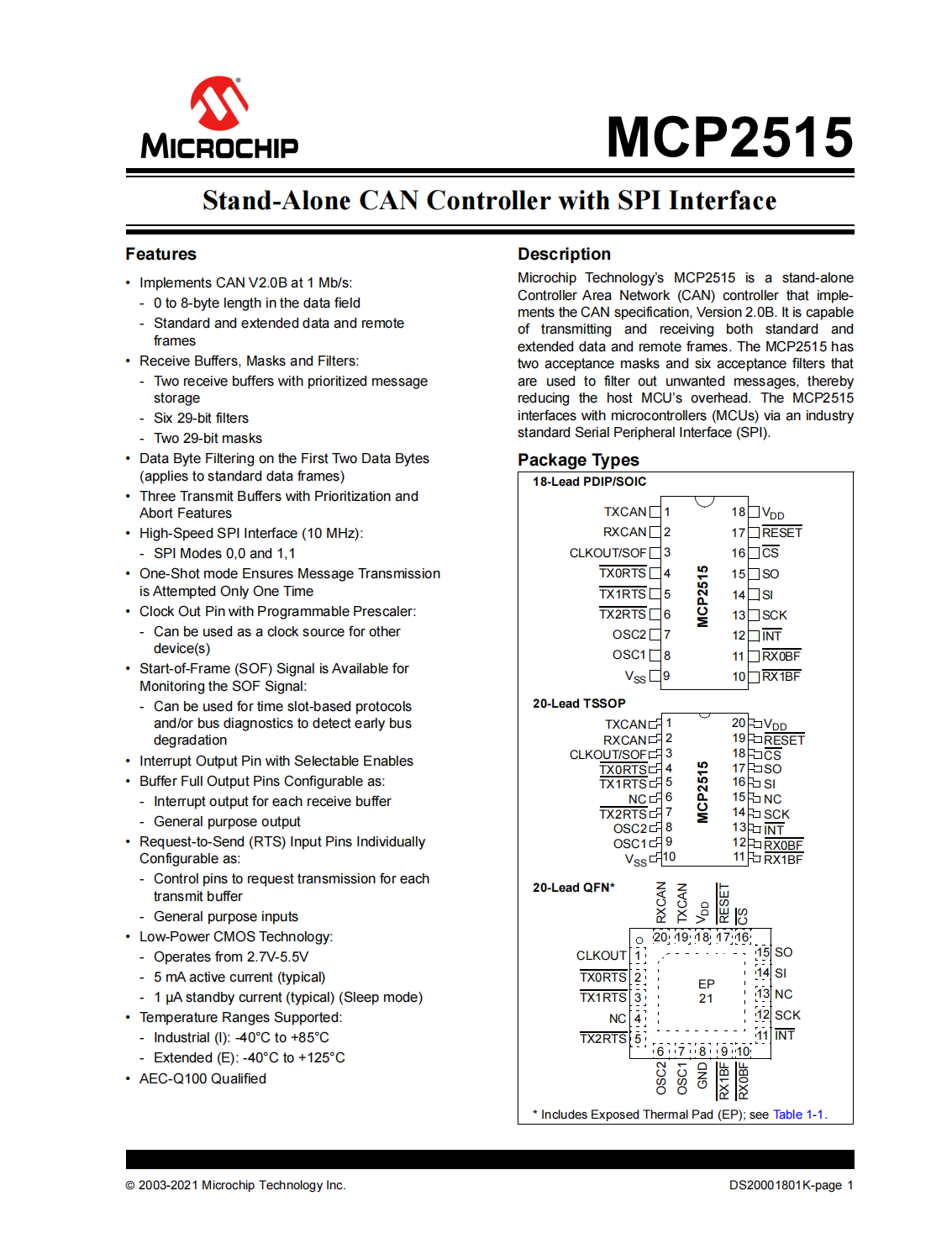 Microchip Technology’s MCP2515 is a stand-alone Controller Area Network(CAN)controller that implements the CAN specification,Version 2.0B.It is capable of transmitting and receiving both standard and extended data and remote frames.The MCP2515 has two acceptance masks and six acceptance filters that are used to filter out unwanted messages,thereby reducing the host MCU’s overhead.The MCP2515 interfaces with microcontrollers(MCUs)via an industry standard Serial Peripheral Interface(SPI).