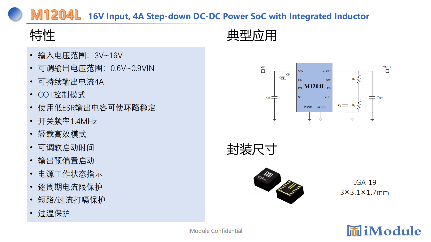 The M1204L is a 4A step-down switching mode Power SoC(System on Chip)with integrated power MosFETs,inductor in LGA-19 package.The input voltage is from 3V to 16V and the switching frequency is fixed at 1.4MHz.