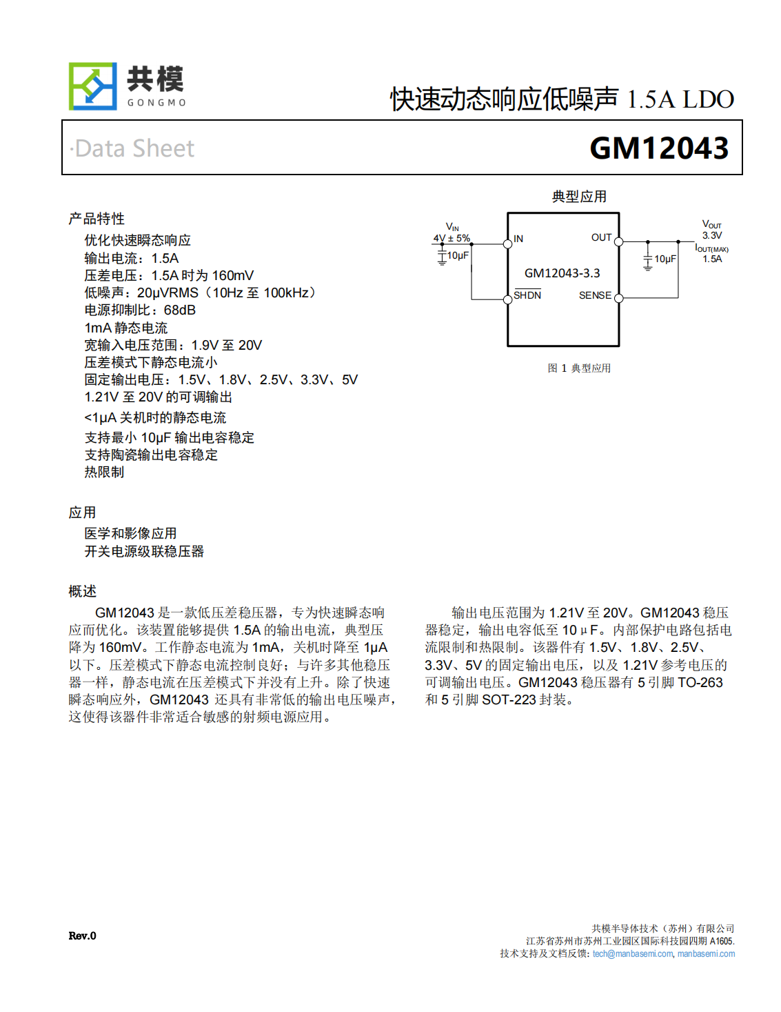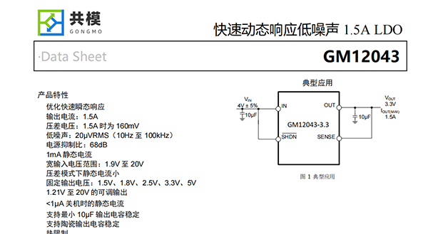 GM12043是一款低壓差穩(wěn)壓器,專為快速瞬態(tài)響應而優(yōu)化。該裝置能夠提供1.5A的輸出電流,典型壓降為160mV。工作靜態(tài)電流為1mA,關(guān)機時降至1μA以下。壓差模式下靜態(tài)電流控制良好;與許多其他穩(wěn)壓器一樣,靜態(tài)電流在壓差模式下并沒有上升。除了快速瞬態(tài)響應外,GM12043還具有非常低的輸出電壓噪聲,這使得該器件非常適合敏感的射頻電源應用。輸出電壓范圍為1.21V至20V。GM12043穩(wěn)壓器穩(wěn)定,輸出電容低至10μF。內(nèi)部保護電路包括電流限制和熱限制。該器件有1.5V、1.8V、2.5V、3.3V、5V的固定輸出電壓,以及1.21V參考電壓的可調(diào)輸出電壓。GM12043穩(wěn)壓器有5引腳TO-263和5引腳SOT-223封裝。