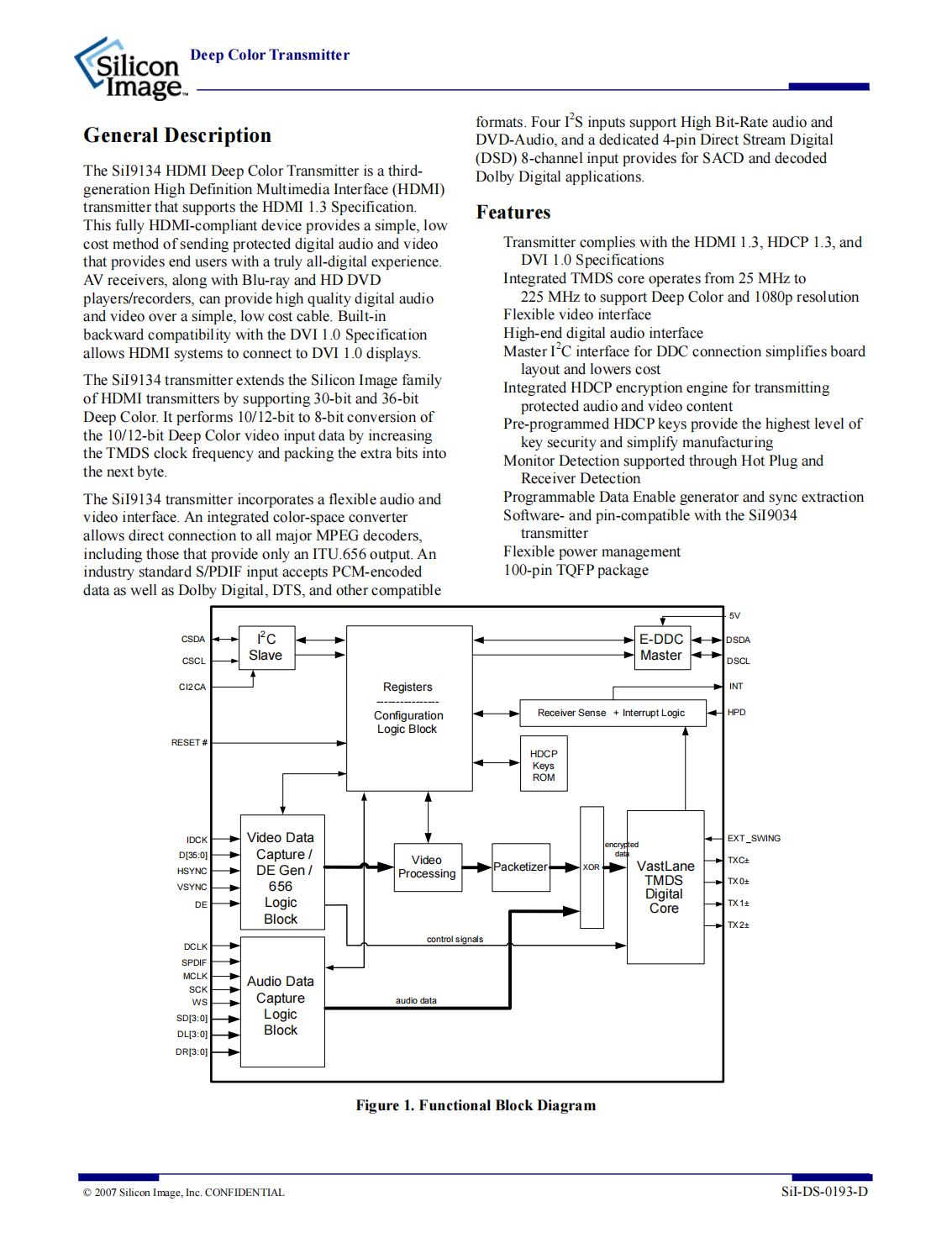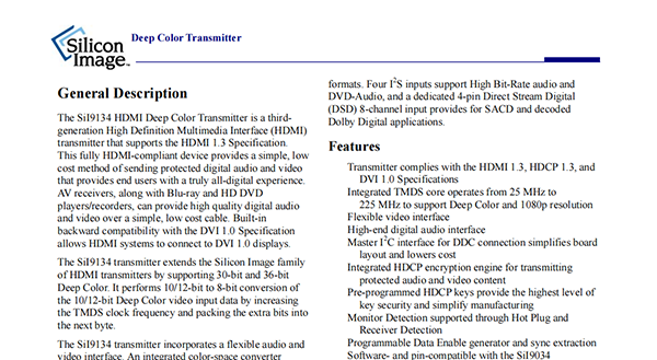 The SiI9134 HDMI Deep Color Transmitter is a thirdgeneration High Definition Multimedia Interface(HDMI)transmitter that supports the HDMI 1.3 Specification.