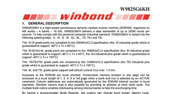 W9825G6KH is a high-speed synchronous dynamic random access memory(SDRAM),organized as 4M words?4 banks?16 bits.W9825G6KH delivers a data bandwidth of up to 200M words per second.To fully comply with the personal computer industrial standard,W9825G6KH is sorted into the following speed grades:-5,-5I,-6,-6I,-6J,-6L,-75,75J and 75L.