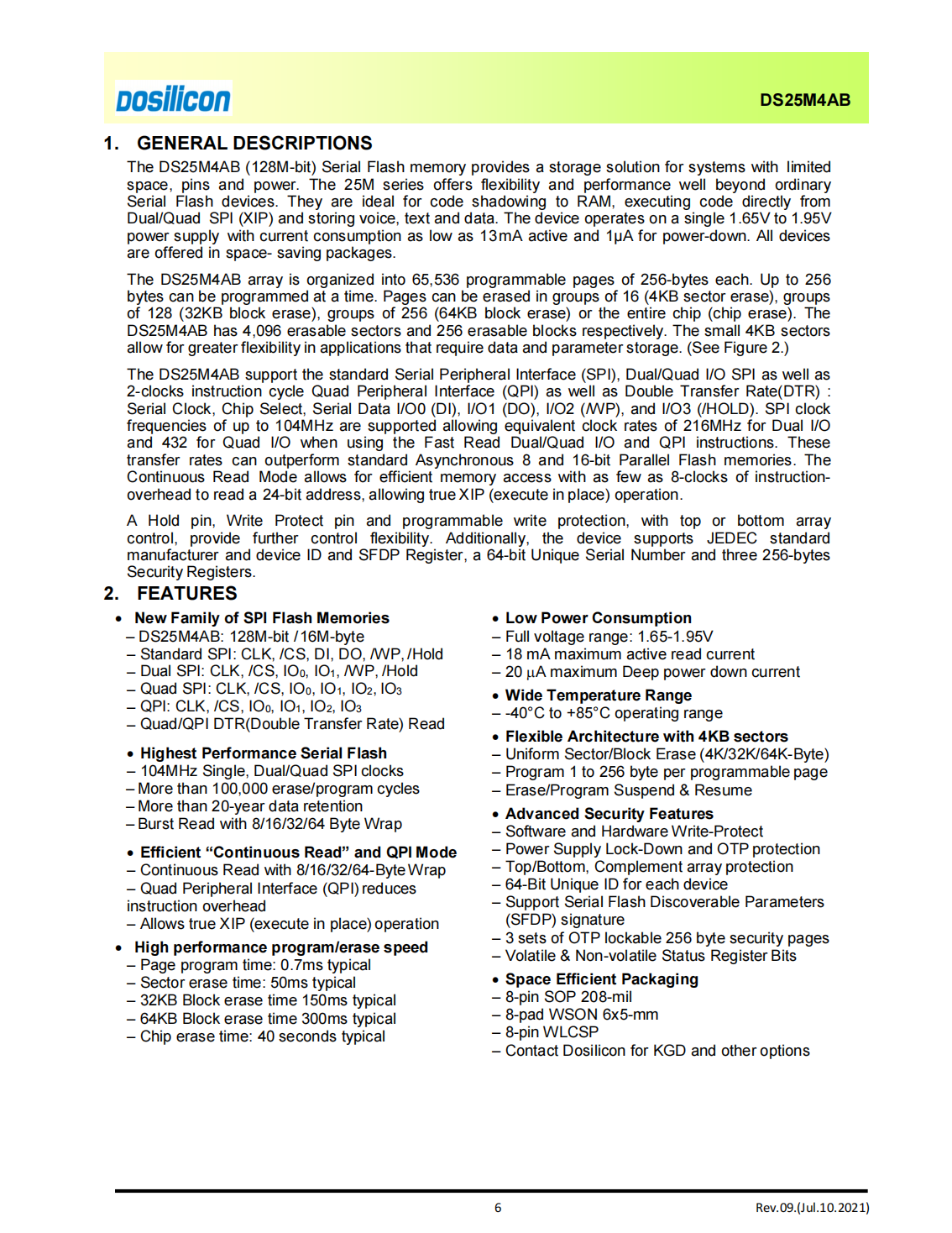 The DS25M4AB(128M-bit)Serial Flash memory provides a storage solution for systems with limited space,pins and power.The 25M series offers flexibility and performance well beyond ordinary Serial Flash devices.They are ideal for code shadowing to RAM,executing code directly from Dual/Quad SPI(XIP)and storing voice,text and data.The device operates on a single 1.65V to 1.95V power supply with current consumption as low as 13mA active and 1μA for power-down.All devices are offered in space-saving packages.
