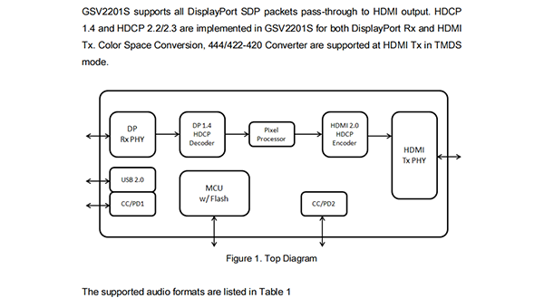 The superior architecture of GSV2201S provides economical smaller footprint solutionsusing QFN48,targeting application of Type-C Hub.GSV2201S supports all DisplayPort SDP packets pass-through to HDMI output.HDCP 1.4 and HDCP 2.2/2.3 are implemented in GSV2201S for both DisplayPort Rx and HDMI Tx.Color Space Conversion,444/422-420 Converter are supported at HDMI Tx in TMDS mode.