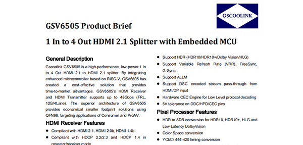 Gscoolink GSV6505 is a high-performance,low-power 1 In to 4 Out HDMI 2.1 to HDMI 2.1 splitter.By integrating enhanced microcontroller based on RISC-V,GSV6505 has created a cost-effective solution that provides time-to-market advantages.GSV6505’s HDMI Receiver and HDMI Transmitter supports up to 48Gbps(FRL,12G/4Lane).The superior architecture of GSV6505 provides economical smaller footprint solutions using QFN96,targeting applications of Consumer and ProAV.