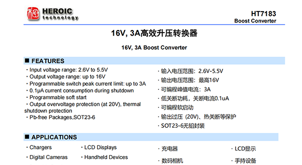 HT7183具有2.6V至5.5V輸入電壓范圍,可為各類(lèi)不同供電的應(yīng)用提供支持。該器件具備3A開(kāi)關(guān)電流能力,并且能夠提供高達(dá)16V的輸出電壓。