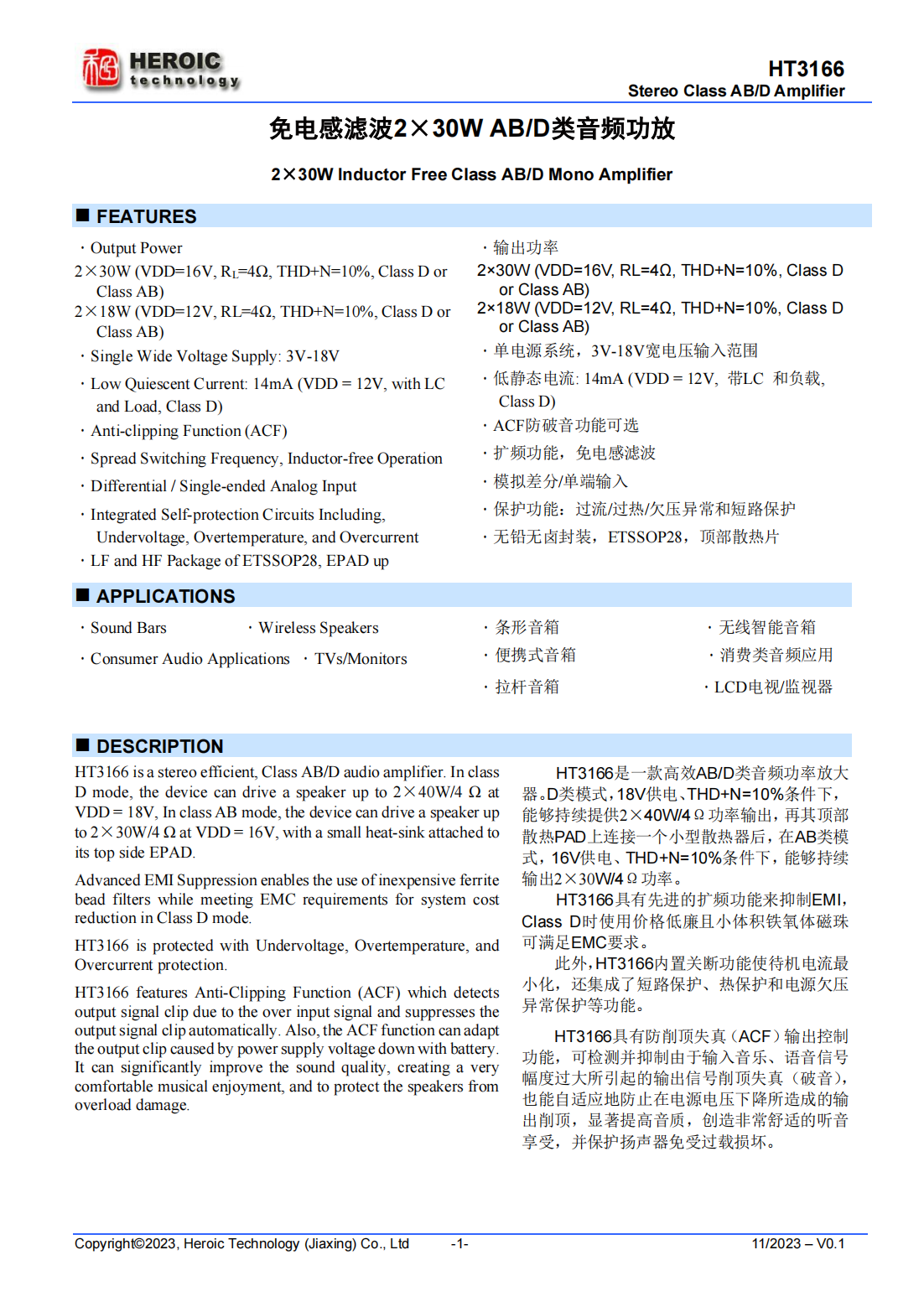 HT3166具有先進的擴頻功能來抑制EMI,Class D時使用價格低廉且小體積鐵氧體磁珠可滿足EMC要求。