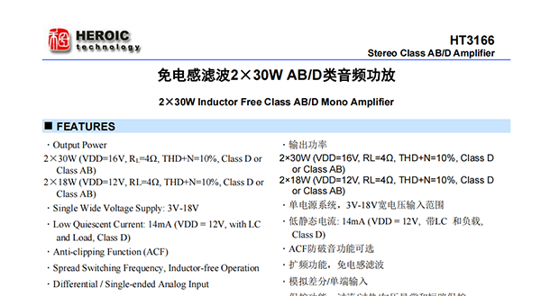 HT3166是一款高效AB/D類音頻功率放大器。D類模式,18V供電、THD+N=10%條件下,能夠持續(xù)提供2×40W/4Ω功率輸出,再其頂部散熱PAD上連接一個小型散熱器后,在AB類模式,16V供電、THD+N=10%條件下,能夠持續(xù)輸出2×30W/4Ω功率。