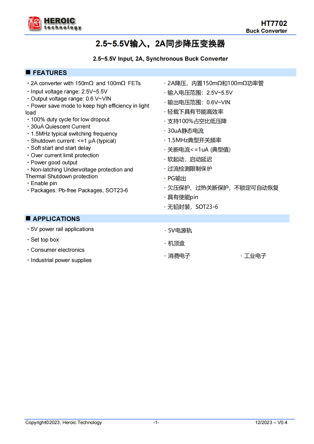 HT7702是一款2A同步降壓轉(zhuǎn)換器,具有最少的外部元件和低關(guān)斷電流。該器件在中到重載時(shí),工作在典型開關(guān)頻率為1.5MHz的PWM模式;在輕載時(shí),器件工作在高效節(jié)能模式。輸出電壓可通過(guò)外部電阻調(diào)節(jié)。HT7702采用SOT23-6封裝。