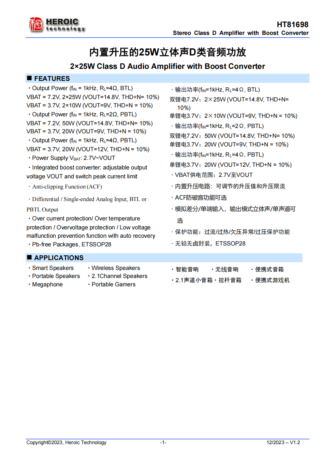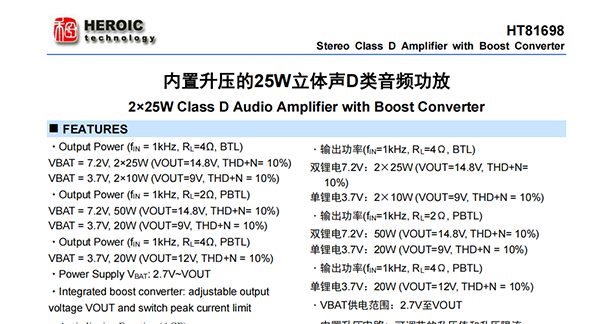 HT81698是一款內(nèi)置升壓的立體聲D類音頻功率放大器,其支持單節(jié)鋰電、雙節(jié)鋰電串聯(lián)、5V、12V等多種輸入,升壓后的電壓提供給功放供電,功放支持雙通道立體聲BTL輸出以及并聯(lián)PBTL單聲道輸出。