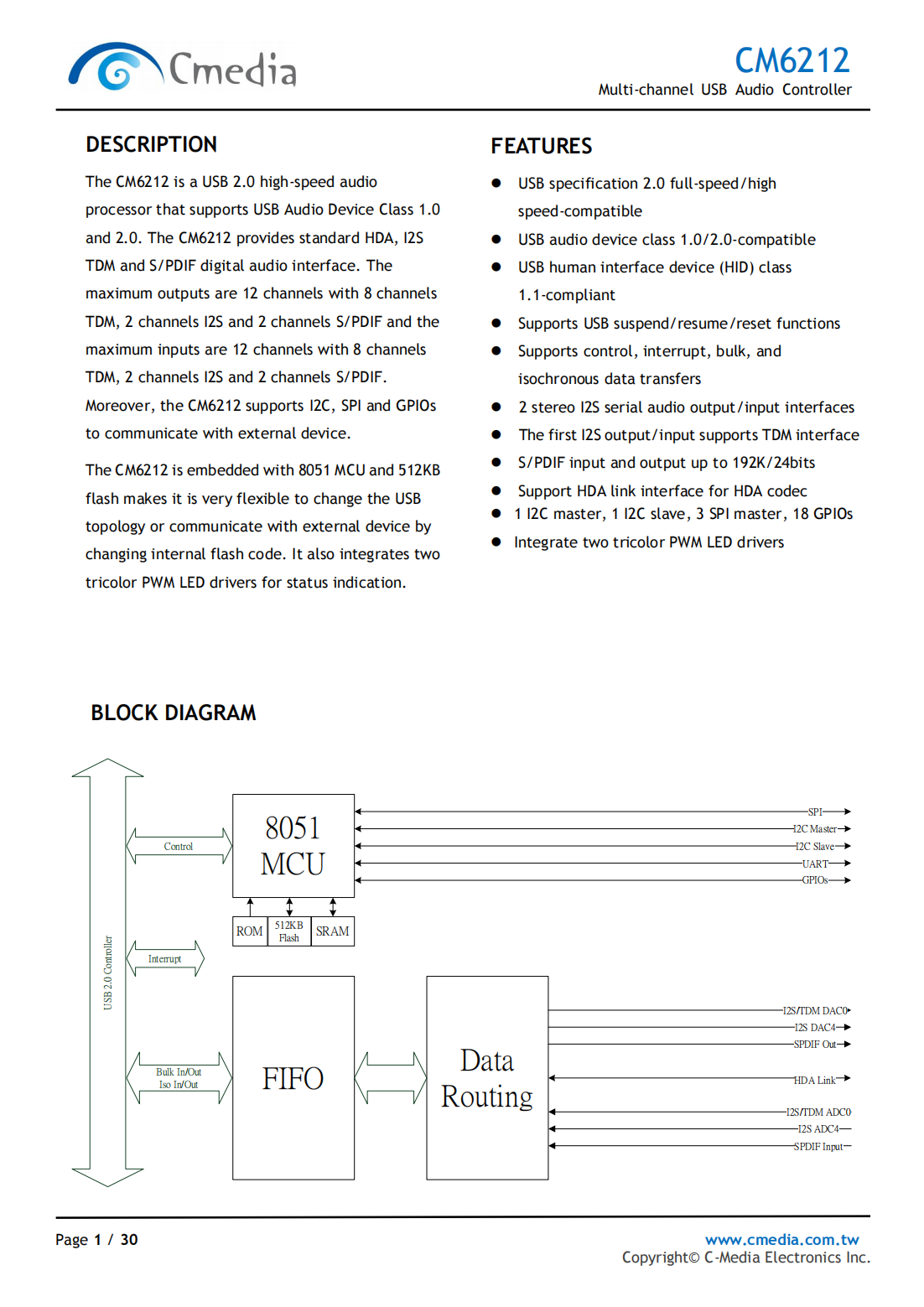 The CM6212 is a USB 2.0 high-speed audio processor that supports USB Audio Device Class 1.0and 2.0.The CM6212 provides standard HDA,I2S TDM and S/PDIF digital audio interface.The maximum outputs are 12 channels with 8 channels TDM,2 channels I2S and 2 channels S/PDIF and the maximum inputs are 12 channels with 8 channels TDM,2 channels I2S and 2 channels S/PDIF.Moreover,the CM6212 supports I2C,SPI and GPIOs to communicate with external device.