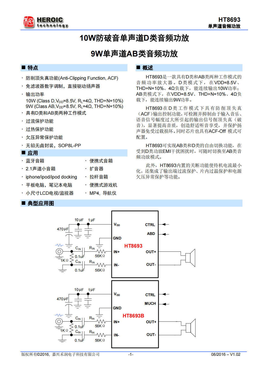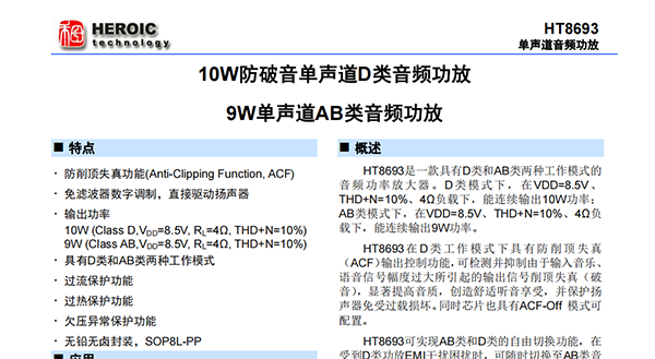 HT8693是一款具有D類和AB類兩種工作模式的音頻功率放大器。D類模式下,在VDD=8.5V、THD+N=10%、4?負(fù)載下,能連續(xù)輸出10W功率;AB類模式下,在VDD=8.5V、THD+N=10%、4?負(fù)載下,能連續(xù)輸出9W功率。