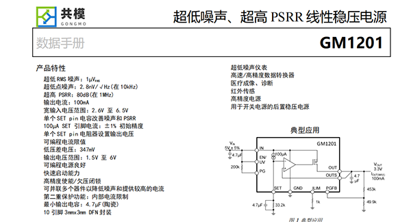 GM1201可在450mV典型壓差電壓條件下提供100mA。正常工作靜態(tài)電流的典型值為1.9mA,并在停機(jī)模式中低于1μA。該器件通過片外電阻調(diào)節(jié)輸出電壓,能夠在寬輸出電壓范圍(1.5V至6V)內(nèi)保持單位增益工作,從而提供幾乎恒定的輸出噪聲、PSRR、帶寬和負(fù)載調(diào)整率,并且這些性能與輸出電壓無關(guān)。此外,該穩(wěn)壓電源還擁有可編程電流限值、快速啟動(dòng)和用于指示輸出電壓調(diào)節(jié)的可編程電源良好信號(hào)。
