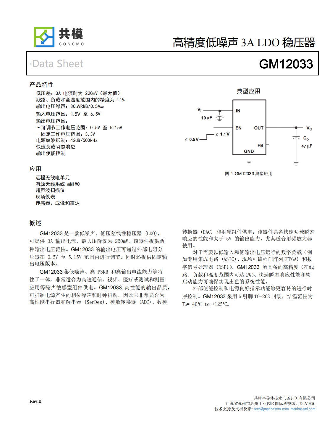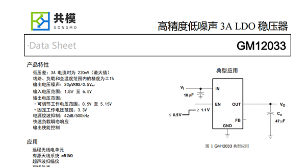 GM12033是一款低噪聲、低壓差線性穩(wěn)壓器(LDO),可提供3A輸出電流,最大壓降僅為220mV。該器件提供兩種輸出電壓范圍。GM12033的輸出電壓可通過外部電阻分壓器在0.5V至5.15V范圍內(nèi)進(jìn)行調(diào)節(jié),同時(shí)還提供固定輸出電壓版本。