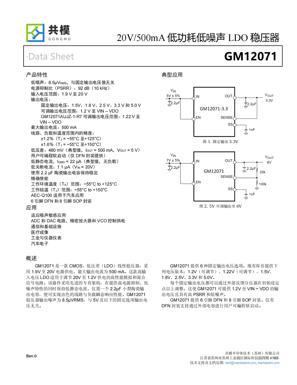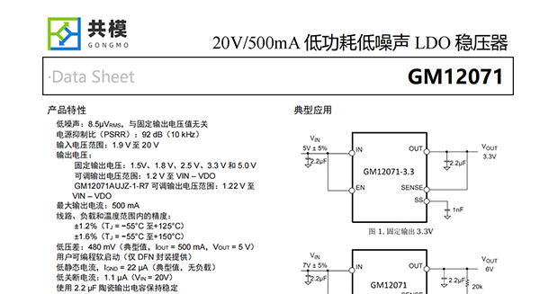 GM12071提供6種固定輸出電壓選項?,F(xiàn)有庫存提供下列電壓版本:1.2V(可調(diào)節(jié))、1.22V(可調(diào)節(jié))、1.5V、1.8V、2.5V、3.3V和5.0V。每個固定輸出電壓都可以通過外部反饋分壓器在初始設(shè)定點以上調(diào)整。這使GM12071可提供1.2V至VIN?VDO的輸出電壓且具有高PSRR和低噪聲。