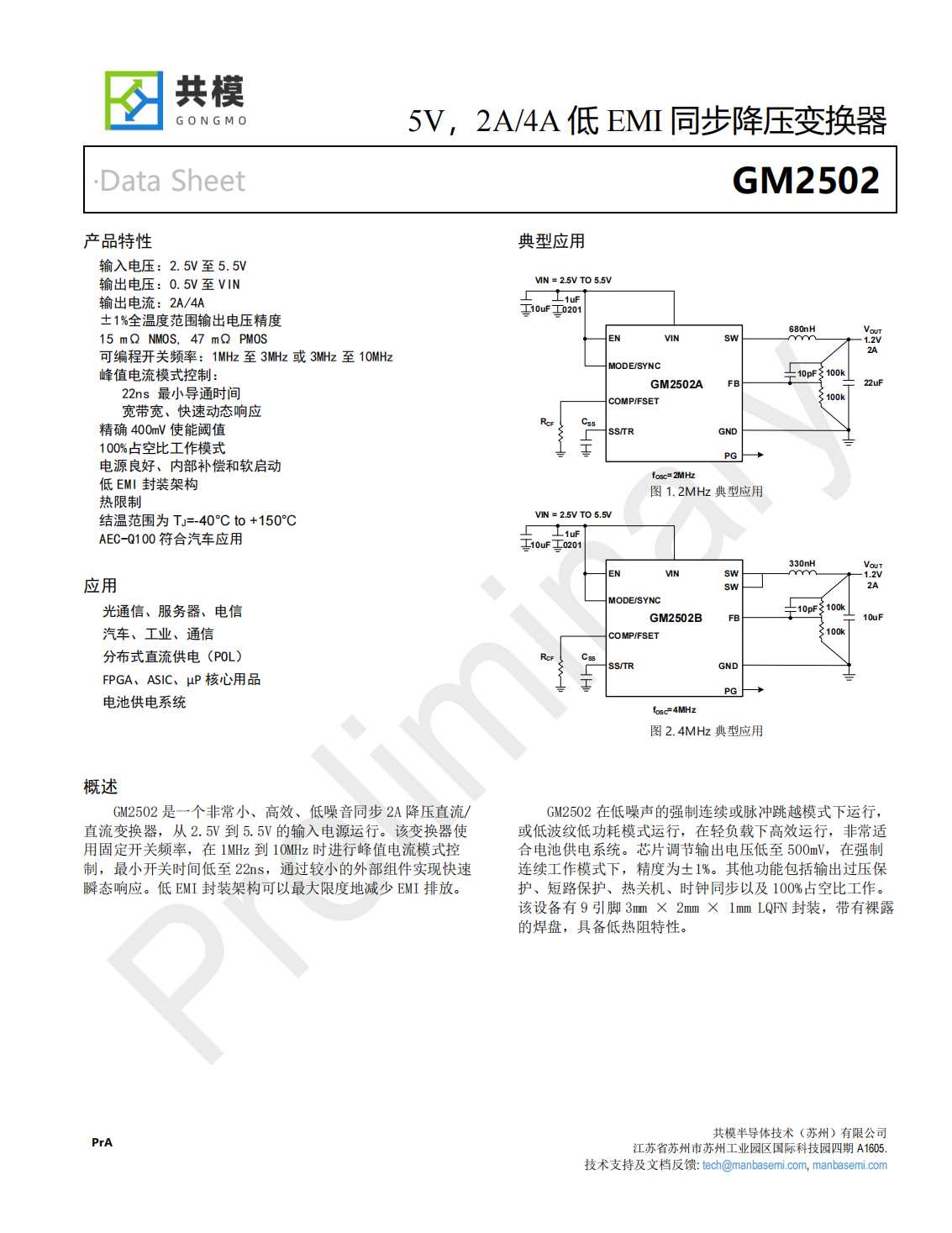 GM2502是一個非常小、高效、低噪音同步2A降壓直流/直流變換器,從2.5V到5.5V的輸入電源運行。該變換器使用固定開關(guān)頻率,在1MHz到10MHz時進行峰值電流模式控制,最小開關(guān)時間低至22ns,通過較小的外部組件實現(xiàn)快速瞬態(tài)響應(yīng)。低EMI封裝架構(gòu)可以最大限度地減少EMI排放。