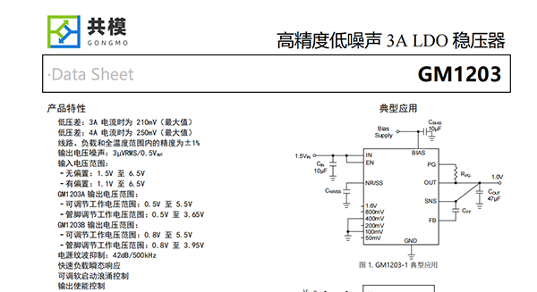 GM1203集低噪聲、高PSRR和高輸出電流能力等特性于一體,非常適合為高速通信、視頻、醫(yī)療或測(cè)試和測(cè)量應(yīng)用等噪聲敏感型組件供電。GM1203高性能的輸出品質(zhì),可抑電源產(chǎn)生的相位噪聲和時(shí)鐘抖動(dòng),因此它非常適合為高性能串行器和解串器(SerDes)、模數(shù)轉(zhuǎn)換器(ADC)、數(shù)模轉(zhuǎn)換器(DAC)和射頻組件供電。該器件具備快速負(fù)載瞬態(tài)響應(yīng)的性能和大于5V的輸出能力,尤其適合射頻放大器使用。對(duì)于需要以低輸入和低輸出電壓運(yùn)行的數(shù)字負(fù)載(例如專(zhuān)用集成電路(ASIC)、現(xiàn)場(chǎng)可編程門(mén)陣列(FPGA)和數(shù)字信號(hào)處理器(DSP)),GM1203所具備的高精度(在線(xiàn)路、負(fù)載和溫度范圍內(nèi)可達(dá)1%)、快速瞬態(tài)響應(yīng)性能和軟啟動(dòng)能力可確保實(shí)現(xiàn)出色的系統(tǒng)性能。外部使能控制和電源良好指示功能夠更容易的進(jìn)行時(shí)序控制。GM1203采用20腳3.5mm×3.5mm QFN和5mm×5mm QFN封裝,結(jié)溫范圍為T(mén)J=-40°C to+125°C和TJ=-55°C to+125°C。
