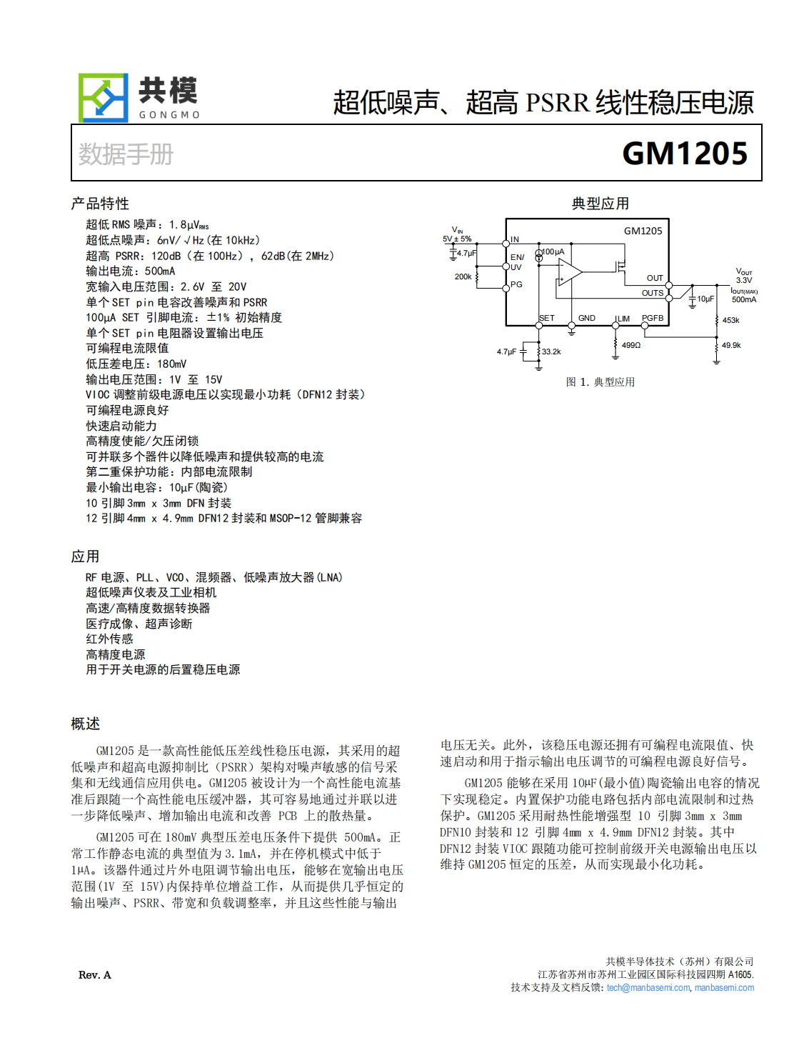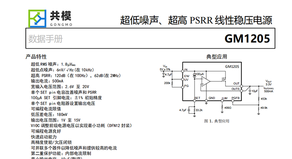 GM1205是一款高性能低壓差線性穩(wěn)壓電源,其采用的超低噪聲和超高電源抑制比(PSRR)架構(gòu)對(duì)噪聲敏感的信號(hào)采集和無線通信應(yīng)用供電。GM1205被設(shè)計(jì)為一個(gè)高性能電流基準(zhǔn)后跟隨一個(gè)高性能電壓緩沖器,其可容易地通過并聯(lián)以進(jìn)一步降低噪聲、增加輸出電流和改善PCB上的散熱量。