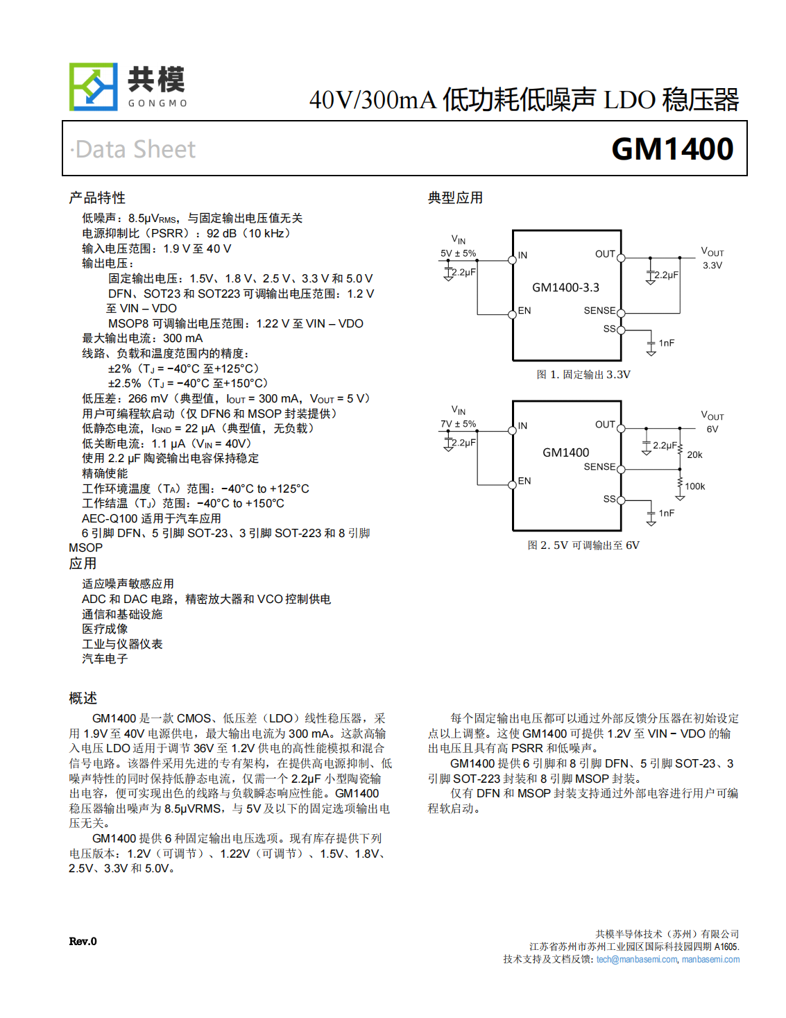 GM1400是一款CMOS、低壓差(LDO)線性穩(wěn)壓器,采用1.9V至40V電源供電,最大輸出電流為300 mA。這款高輸入電壓LDO適用于調(diào)節(jié)36V至1.2V供電的高性能模擬和混合信號(hào)電路。該器件采用先進(jìn)的專(zhuān)有架構(gòu),在提供高電源抑制、低噪聲特性的同時(shí)保持低靜態(tài)電流,僅需一個(gè)2.2μF小型陶瓷輸出電容,便可實(shí)現(xiàn)出色的線路與負(fù)載瞬態(tài)響應(yīng)性能。GM1400穩(wěn)壓器輸出噪聲為8.5μVRMS,與5V及以下的固定選項(xiàng)輸出電壓無(wú)關(guān)。
