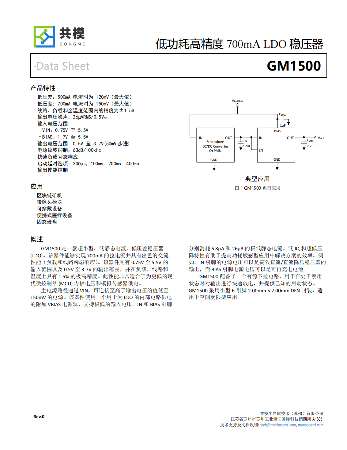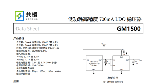 GM1500是一款超小型、低靜態(tài)電流、低壓差穩(wěn)壓器(LDO)。該器件能夠?qū)崿F(xiàn)700mA的輸出電流,具有0.75V至5.5V的輸入范圍以及0.5V至3.7V的輸出范圍,并在負(fù)載、線路和溫度上具有1.5%的極高精度。