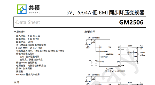 GM2506是一個(gè)非常小、高效、低噪音同步6A降壓直流/直流變換器,從2.5V到5.5V的輸入電源運(yùn)行。該變換器使用固定開(kāi)關(guān)頻率,在1MHz到10MHz時(shí)進(jìn)行峰值電流模式控制,最小開(kāi)關(guān)時(shí)間低至22ns,通過(guò)較小的外部組件實(shí)現(xiàn)快速瞬態(tài)響應(yīng)。低EMI封裝架構(gòu)可以最大限度地減少EMI排放。