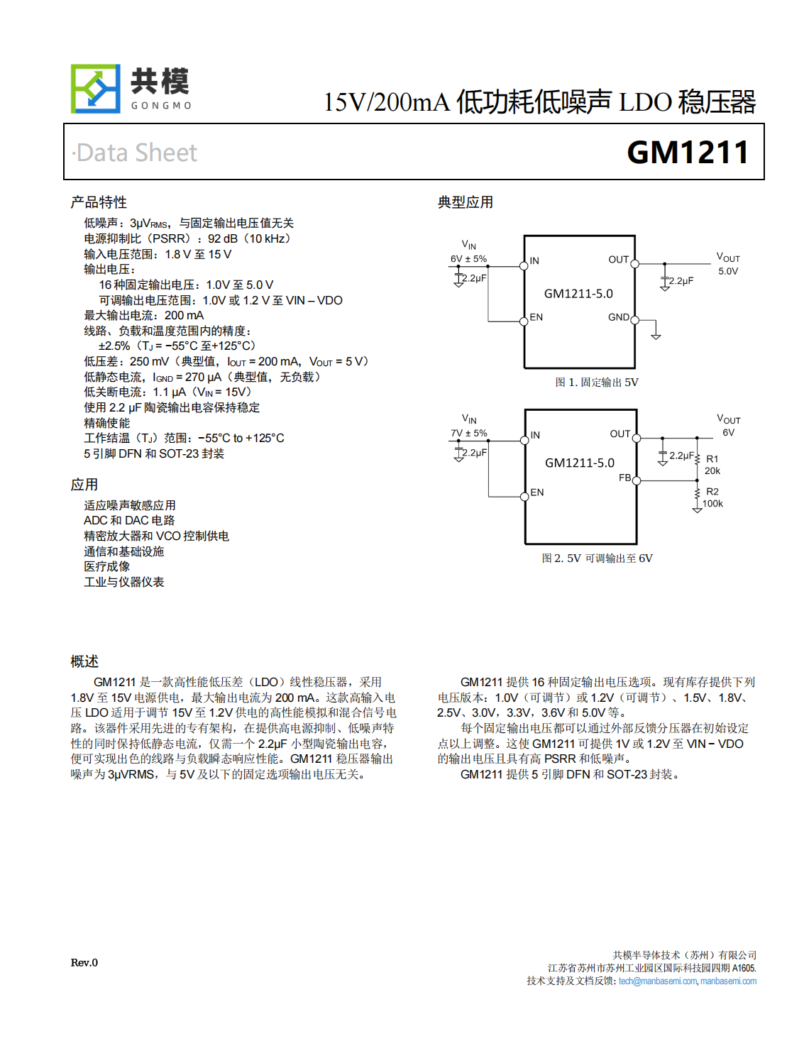 GM1211提供16種固定輸出電壓選項?,F(xiàn)有庫存提供下列電壓版本:1.0V(可調(diào)節(jié))或1.2V(可調(diào)節(jié))、1.5V、1.8V、2.5V、3.0V,3.3V,3.6V和5.0V等。每個固定輸出電壓都可以通過外部反饋分壓器在初始設(shè)定點以上調(diào)整。這使GM1211可提供1V或1.2V至VIN?VDO的輸出電壓且具有高PSRR和低噪聲。