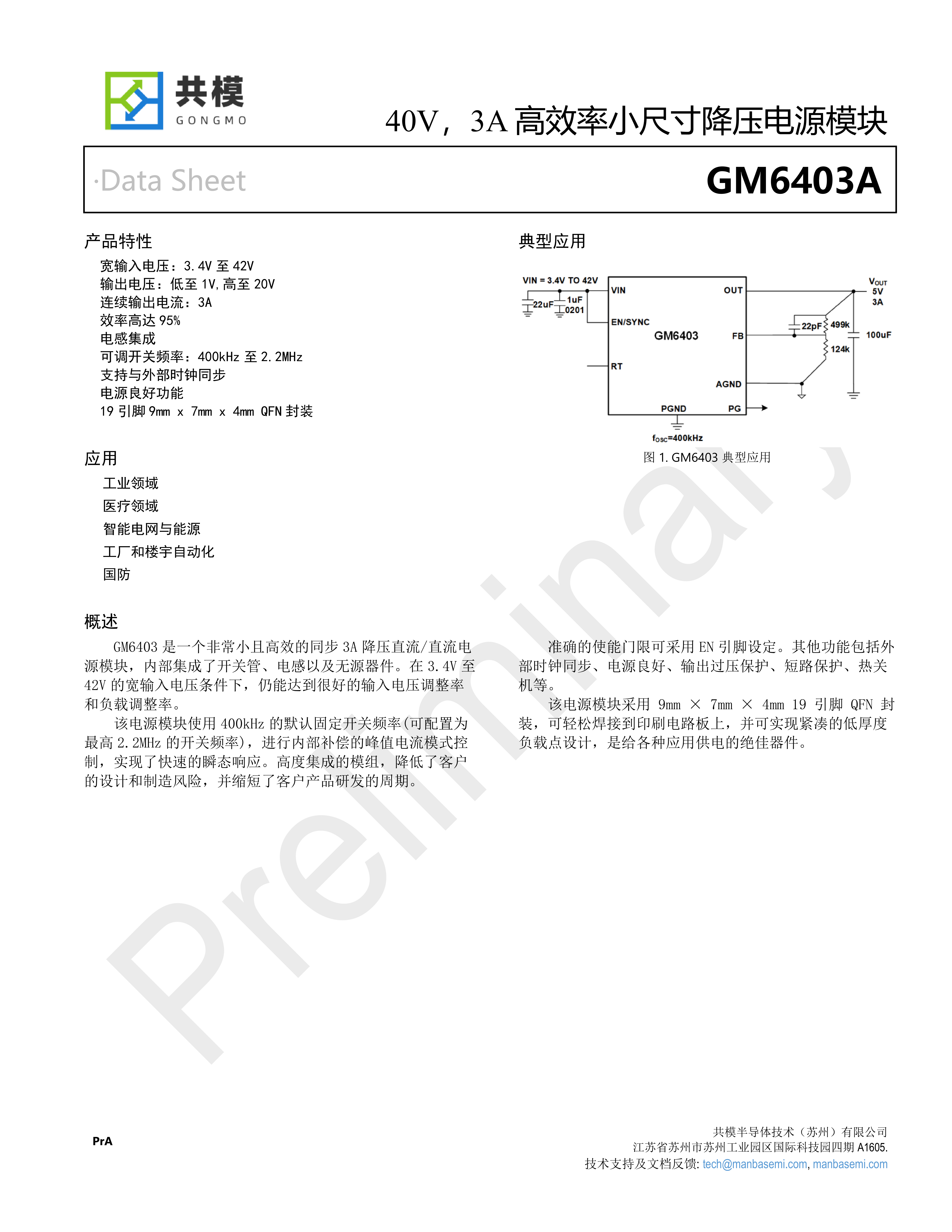 GM6403 是一個(gè)非常小且高效的同步 3A 降壓直流/直流電 源模塊,內(nèi)部集成了開關(guān)管、電感以及無源器件