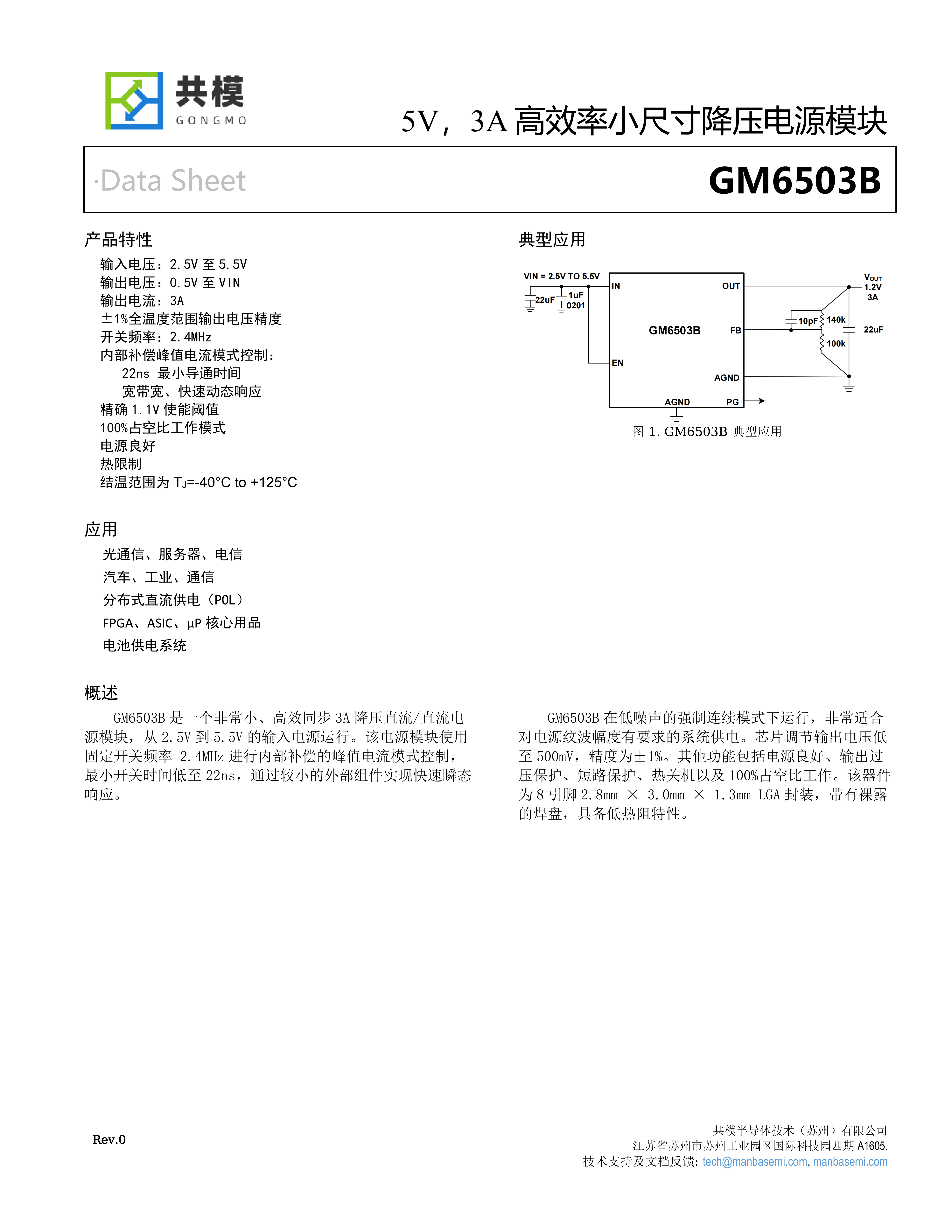 GM6503B是一個(gè)非常小、高效同步3A降壓直流/直流電源模塊,從2.5V到5.5V的輸入電源運(yùn)行。該電源模塊使用固定開(kāi)關(guān)頻率2.4MHz進(jìn)行內(nèi)部補(bǔ)償?shù)姆逯惦娏髂J娇刂疲钚¢_(kāi)關(guān)時(shí)間低至22ns,通過(guò)較小的外部組件實(shí)現(xiàn)快速瞬態(tài)響應(yīng)。