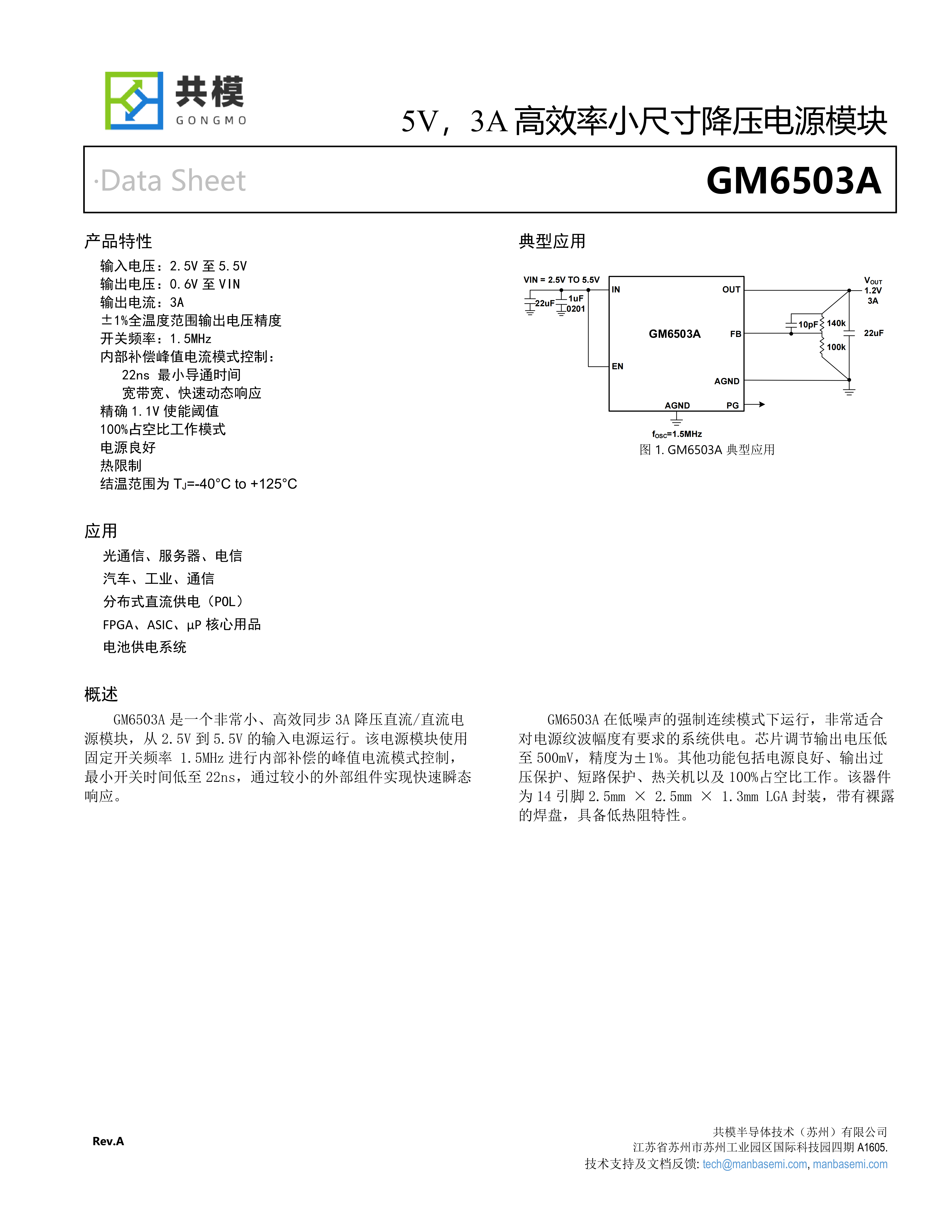 GM6503A是一個非常小、高效同步3A降壓直流/直流電源模塊,從2.5V到5.5V的輸入電源運行。該電源模塊使用固定開關(guān)頻率1.5MHz進行內(nèi)部補償?shù)姆逯惦娏髂J娇刂?,最小開關(guān)時間低至22ns,通過較小的外部組件實現(xiàn)快速瞬態(tài)響應(yīng)。